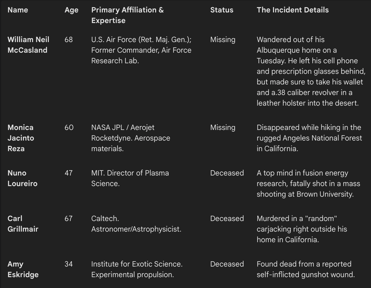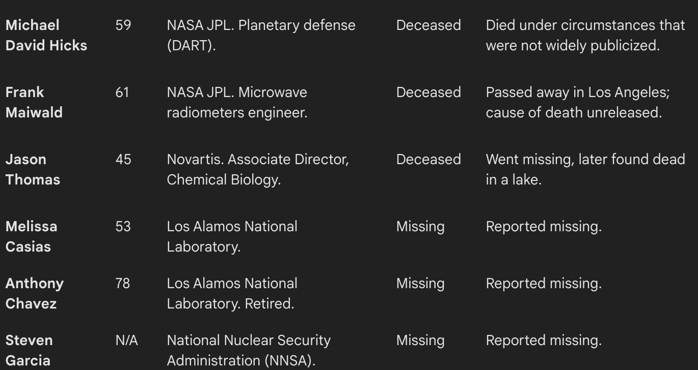Throw in Carl Grillmair, a brilliant Caltech astrophysicist allegedly killed in a "random" carjacking by a 29-year-old on his own porch, and Frank Maiwald and Michael Hicks, two NASA JPL engineers who just turned up dead without much public explanation, and the "random coincidence" excuse starts looking like Swiss cheese.