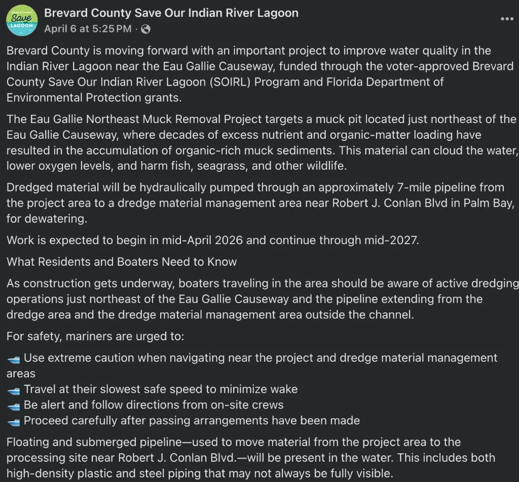 Just this week, the county announced the kickoff of the Eau Gallie Northeast Muck Removal Project, funded by the voter-approved Save Our Indian River Lagoon (SOIRL) program and the Florida Department of Environmental Protection.