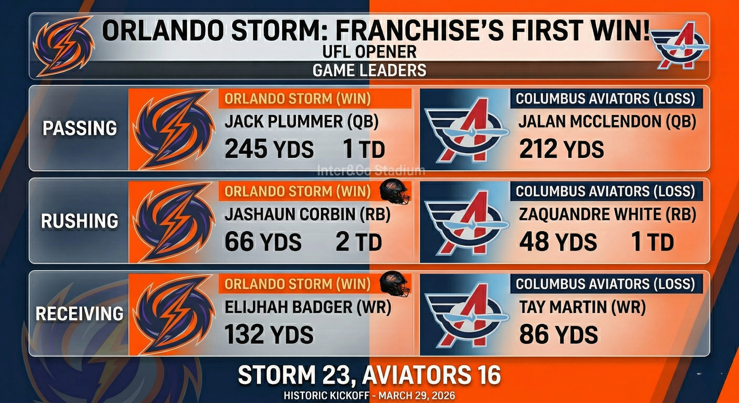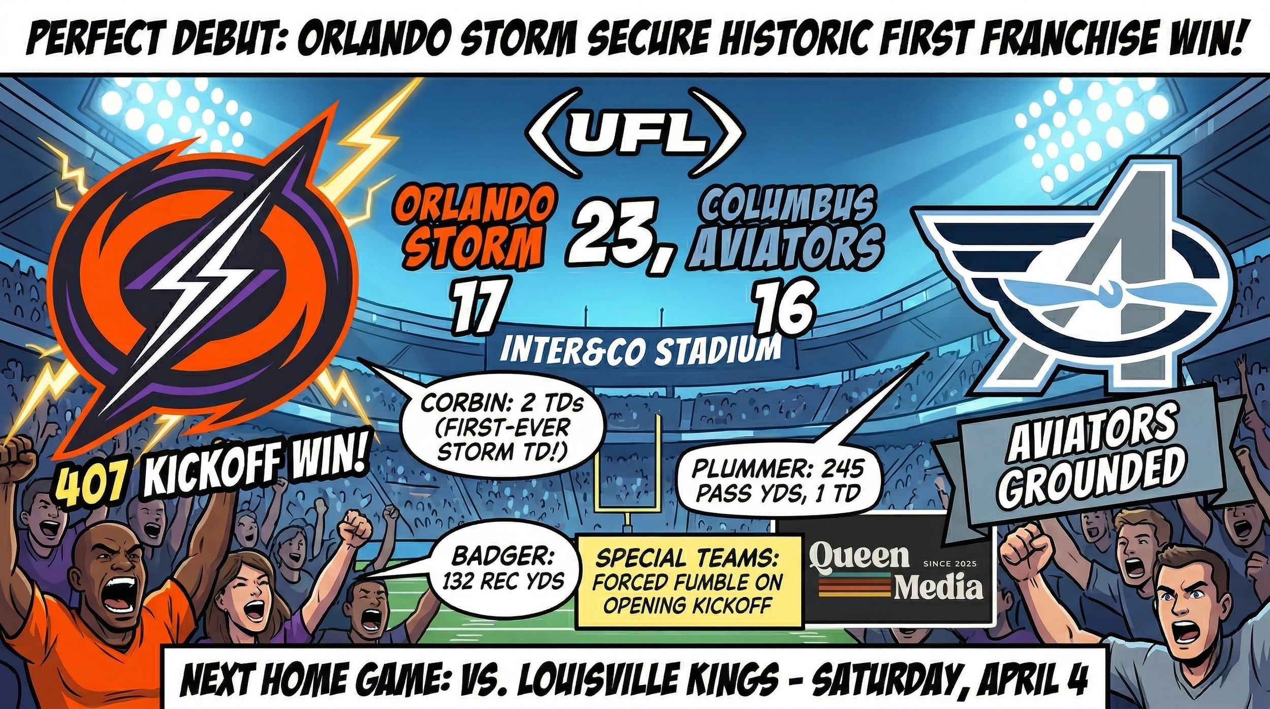 ORLANDO, FL — The energy at Inter&Co Stadium was electric on Sunday night as the Orlando Storm made their highly anticipated United Football League (UFL) debut. Playing under the lights for the "407 Kickoff," the Storm delivered exactly what the hometown crowd came to see, taking down the Columbus Aviators 23-16 to secure the first victory in franchise history.