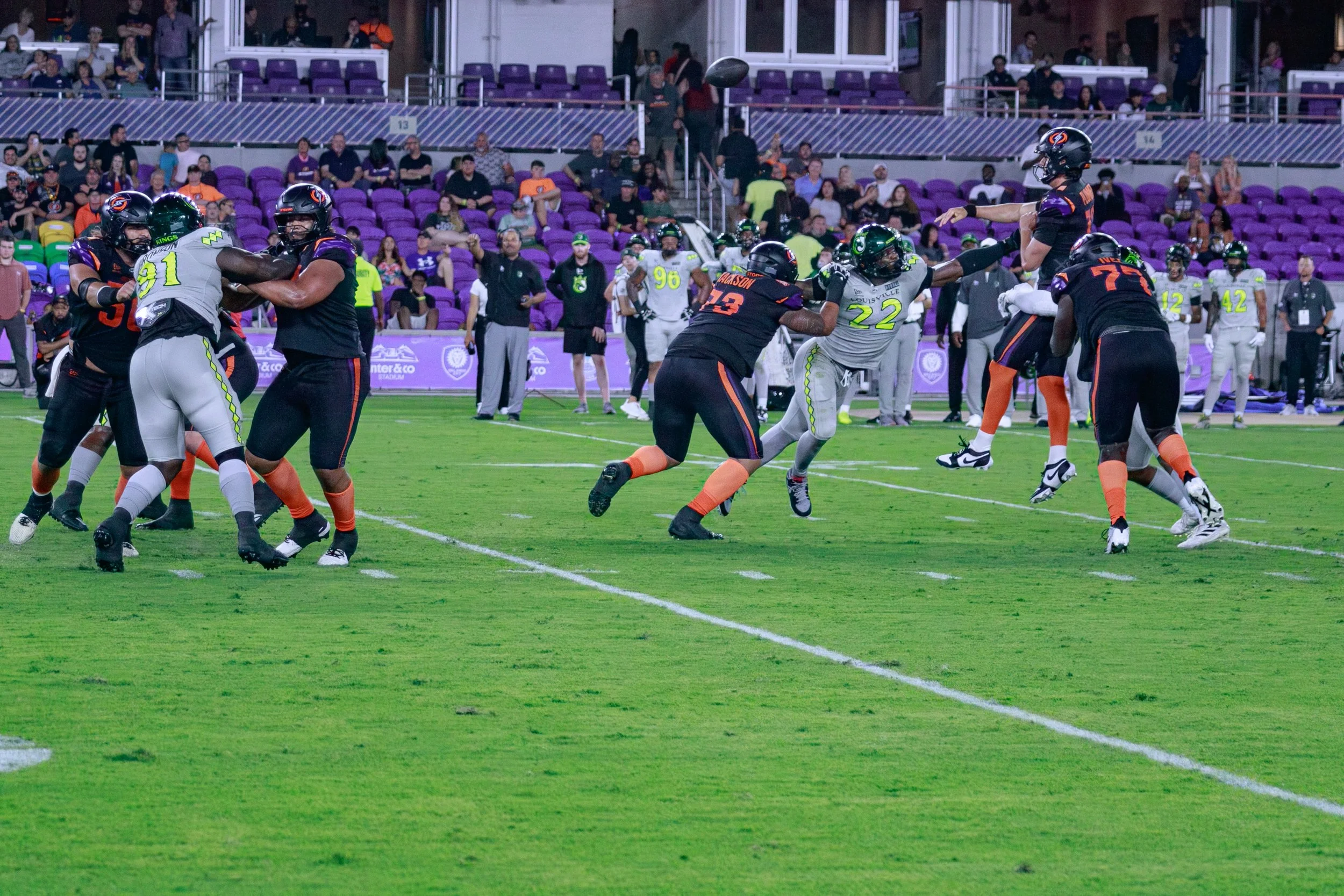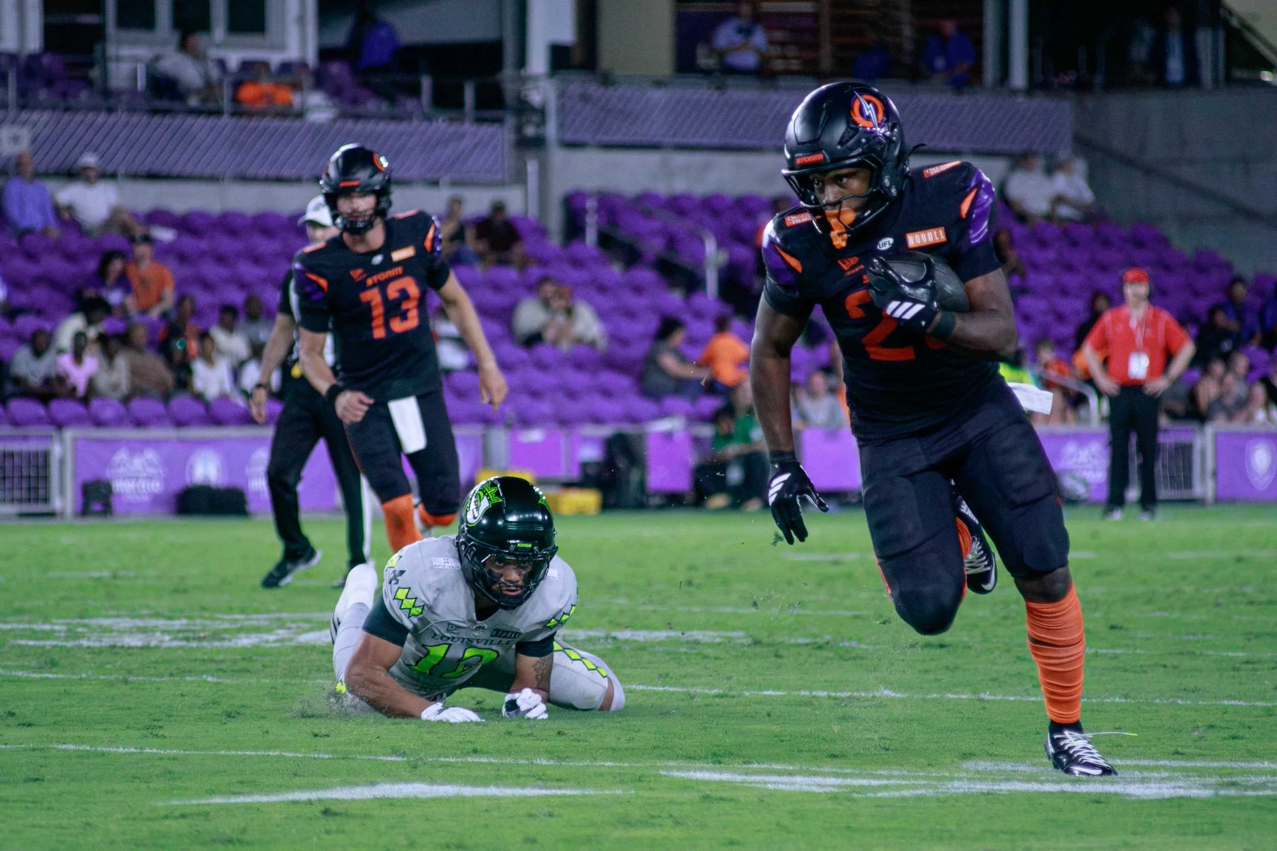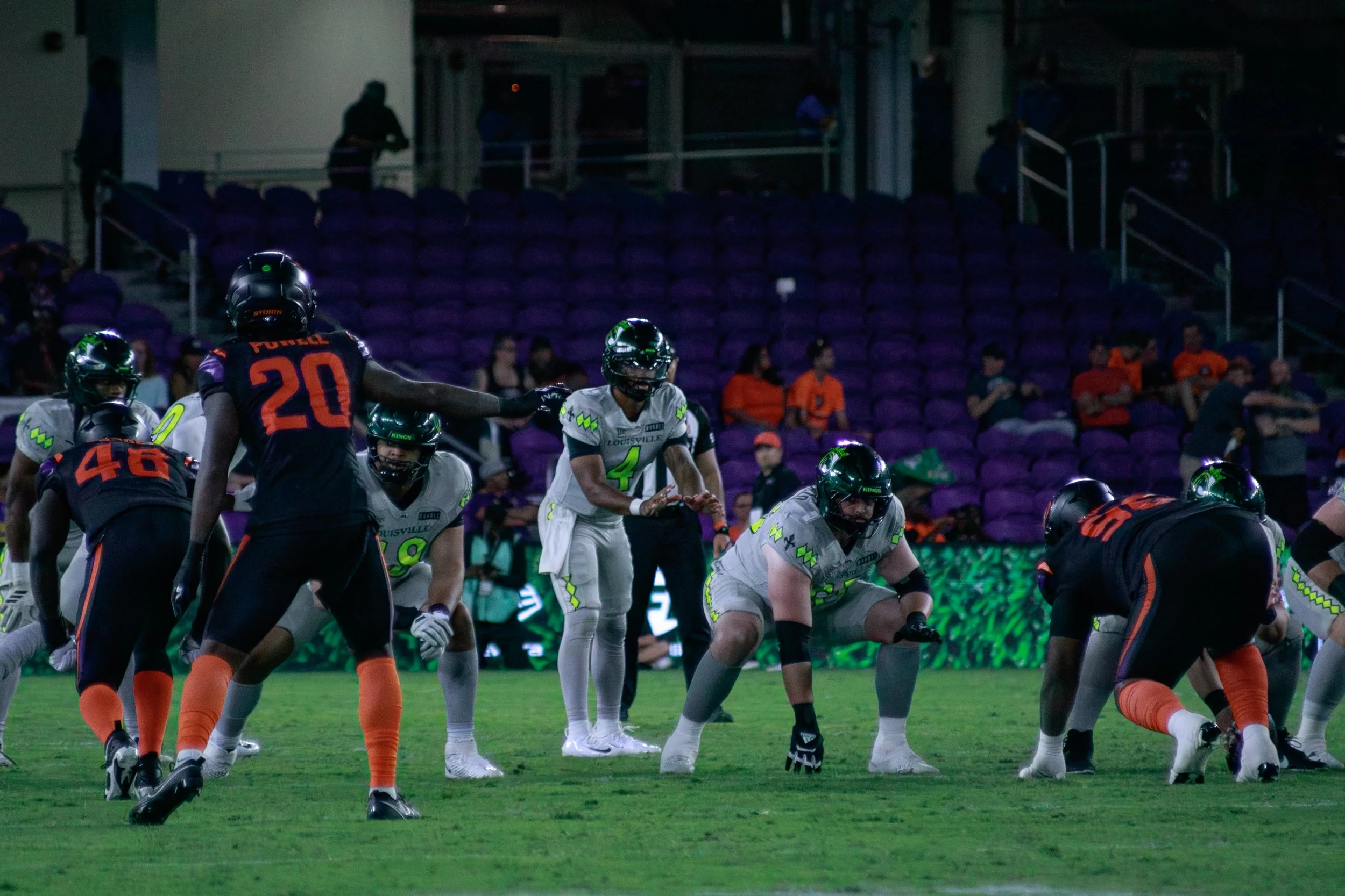 Louisville’s offense, leaning on Chandler Rogers under center, was hitting the flats with impressive, repetitive consistency. They were getting the ball out fast and keeping the chains moving. More concerning for Orlando, Rogers was heavily utilizing a simple slant route right behind the linebackers. The Storm were stubbornly sitting in a vanilla two-high safety shell. Because those safeties were parked deep and the linebackers were instinctively biting on the underneath action in the flats, the middle of the field was left wide open. For a minute there, the Orlando defense looked a bit like a tourist trying to navigate I-4 at rush hour—just a little stuck in traffic while the Kings drove right by.